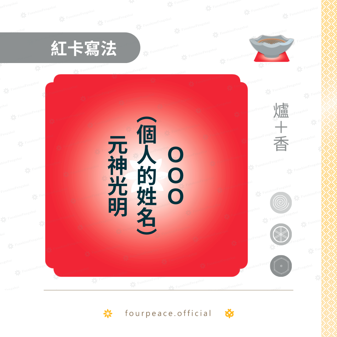 祈福紅卡的書寫方式採用直式書寫、由上至下、從右至左,並以完整的姓名或明確空間地址書寫。若為英文語系使用者,則以慣用的橫式書寫即可。