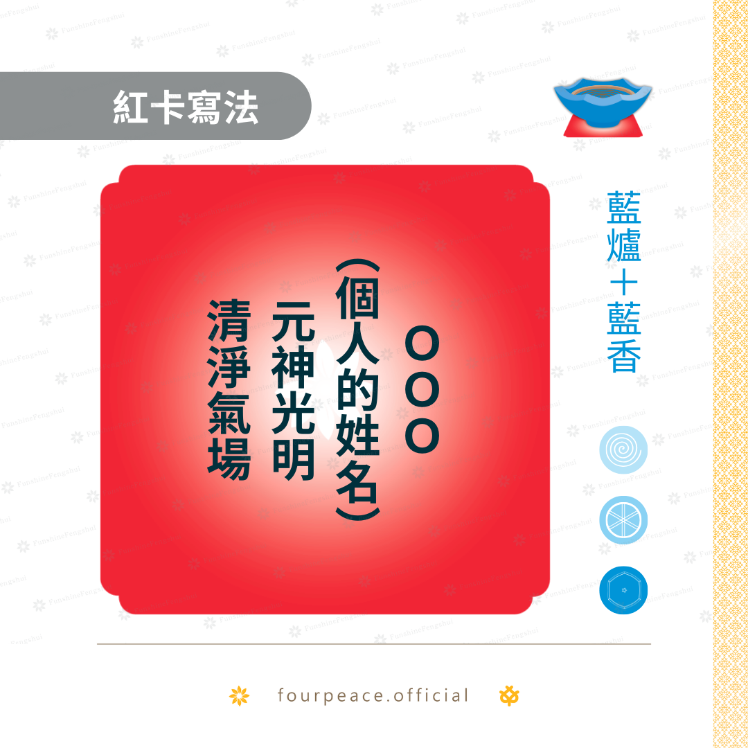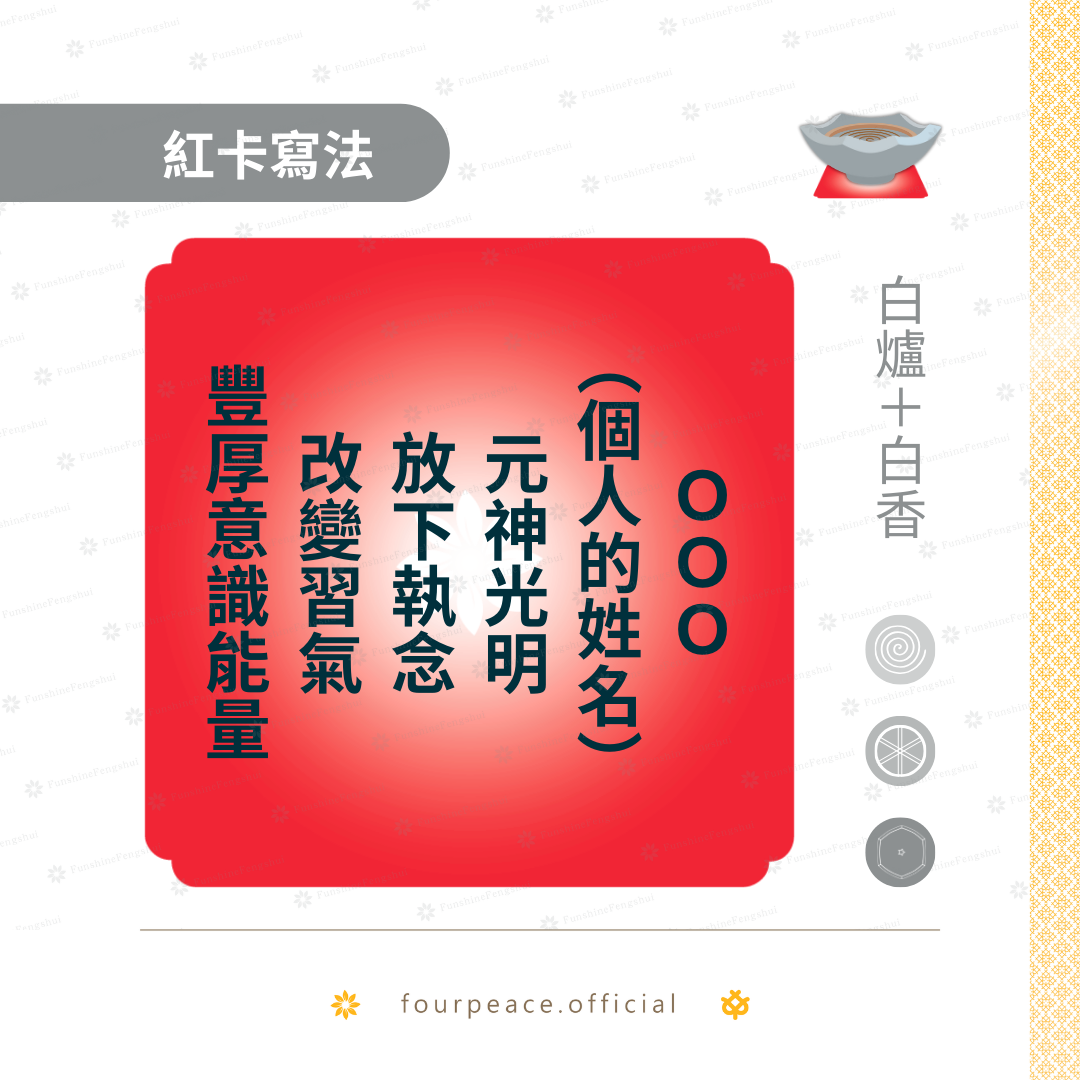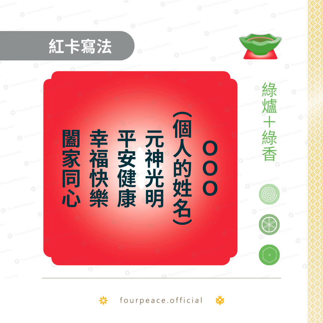 以下分享常用的祈福紅卡寫法提供典友參考,請使用正向用語書寫。香品顏色基本以下方備註為主,部分可彈性運用,通則為: