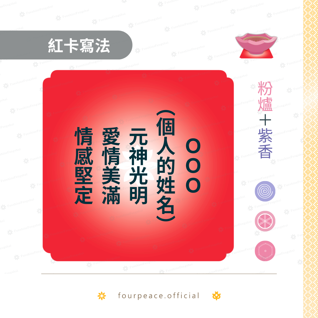 祈福紅卡可隨時運用於家中或辦公空間等執行日常祈願。如果是專案和解,則建議至廟宇請主神協助轉撥,詳情可參考蓮花祈福香供粉篇。